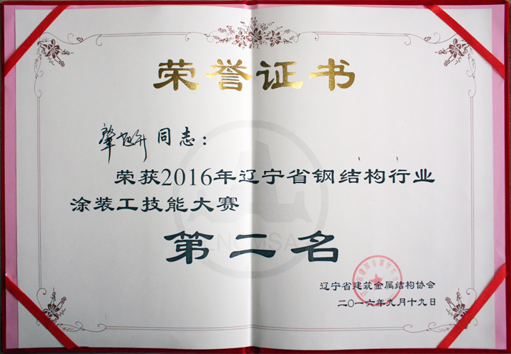 2016年9月19日,由遼寧省建筑金屬結構協會主辦的遼寧省鋼結構行業(yè)涂裝工技能大賽圓滿落幕。來自全省10家企業(yè)的20名選手參加了最后的決賽。我公司鋼構生產部技工肇旭升獲得第二名的好成績,周文赫獲得榮譽獎。