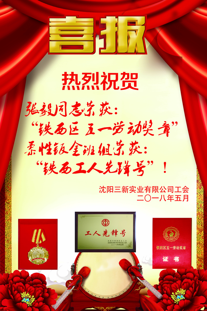 沈陽(yáng)三新實(shí)業(yè)有限公司榮獲“鐵西五一勞動(dòng)獎(jiǎng)狀”,張毅同志榮獲“鐵西區(qū)五一勞動(dòng)獎(jiǎng)?wù)隆?,柔性鈑金班組于永欣等9名同志榮獲“鐵西工人先鋒號(hào)”!