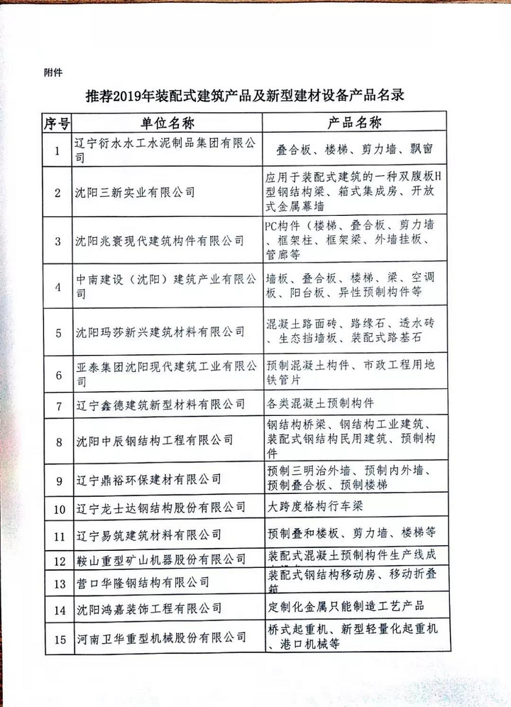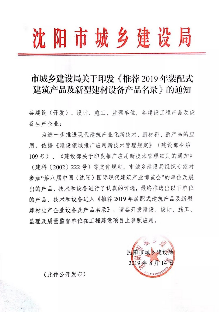 2019年8月14日,沈陽(yáng)市城鄉(xiāng)建設(shè)局發(fā)布《推薦2019年裝配式建筑產(chǎn)品及新型建材設(shè)備產(chǎn)品名錄》,我公司雙腹扳H型鋼結(jié)構(gòu)梁、箱式集成房、開放式金屬幕墻等產(chǎn)品成功入選。