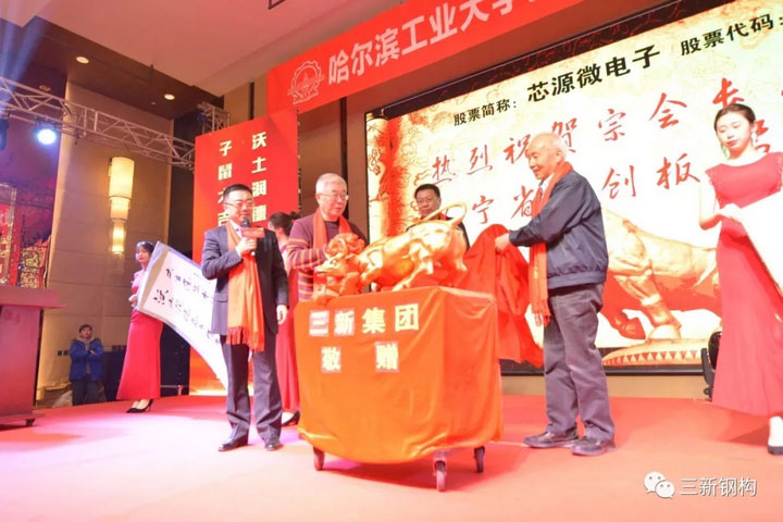 本屆校友會的承辦方,沈陽三新集團(tuán)總經(jīng)理,校友會副會長,本屆年會籌備組組長洪長禧先生代表沈陽校友特為宗會長及芯源微電子贈送銅牛一尊!祝芯源微電子財源廣進(jìn),牛市長紅!