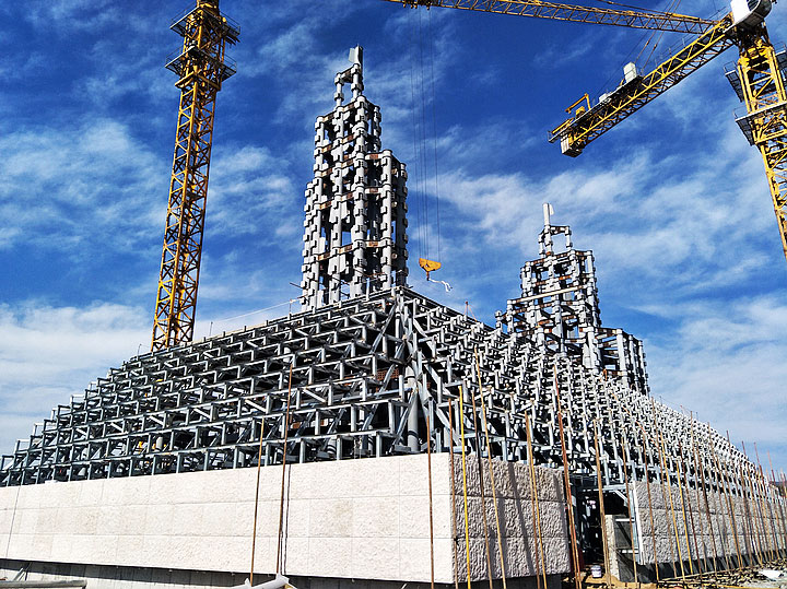 黃帝問道大項(xiàng)目是“帝師之鄉(xiāng)”汝州的重點(diǎn)大型城雕項(xiàng)目,也是當(dāng)?shù)氐貥?biāo)性建筑。該項(xiàng)目肩負(fù)著弘揚(yáng)汝州歷史文化和華夏文明的重任,承載了太多榮耀和希冀。雕像基底面積1400平方米,人像總高度59.8米,主體結(jié)構(gòu)采用圓管鋼框架,外側(cè)采用干掛石材雕塑,總用鋼量2300噸,設(shè)計(jì)使用年限為100年。雕塑內(nèi)部水、電、消防配套齊全。要用鋼結(jié)構(gòu)、石塑傳神地塑造中華民族敬為人皇的黃帝雕像,不失神韻和靈氣,其難度可想而知。三新不負(fù)重托,攻克所有的技術(shù)難題,把大師畫卷中的意象用建筑語言完美呈現(xiàn),體現(xiàn)了三新建筑技術(shù)與藝術(shù)完美融合的建筑理念。施工過程中汝州市政府各級領(lǐng)導(dǎo)多次到現(xiàn)場檢查指導(dǎo),對工程質(zhì)量贊賞有加。我們一起見證了精品的煉成,其中凝聚了三新人的心血和智慧,更體現(xiàn)了三新的創(chuàng)新精神。如今被評為“中國鋼結(jié)構(gòu)金獎”工程,更是實(shí)至名歸。三新帶您一睹黃帝風(fēng)采,領(lǐng)略華夏文明。