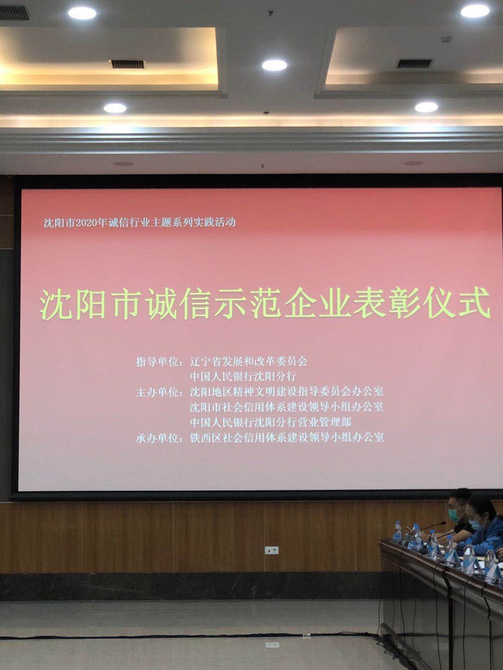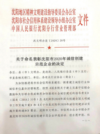 9月10日下午,沈陽市文明辦、市信用辦聯(lián)合召開“沈陽市2020年誠信創(chuàng)建示范企業(yè)”表彰大會。我公司榮獲“沈陽市2020年誠信創(chuàng)建示范企業(yè)”稱號。