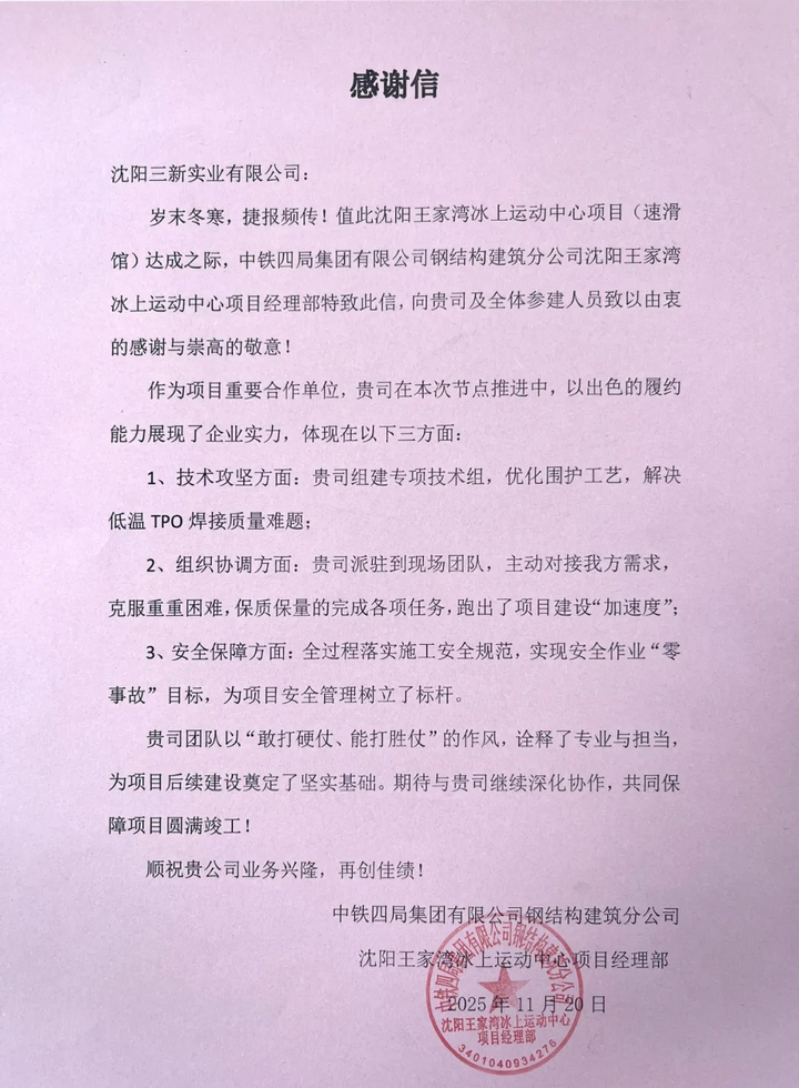 日前,中鐵四局項(xiàng)目部的感謝信跨越金秋而來,字里行間滿是對三新的敬意:“技術(shù)攻堅破局、組織協(xié)調(diào)高效、安全保障扎實(shí),以‘三新力量’為場館如期封閉筑牢根基。”這紙贊譽(yù)背后,是汗水與堅守的沉淀,更是對東北建筑鐵軍匠心與實(shí)力的最佳詮釋。