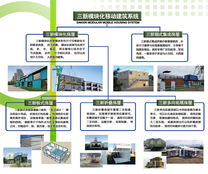 三新模塊化移動(dòng)建筑系統(tǒng)是針對(duì)日益增加的便捷移動(dòng)居住需求開發(fā)的系列產(chǎn)品,包括三新模塊化移動(dòng)建筑和三新箱式集成建筑。